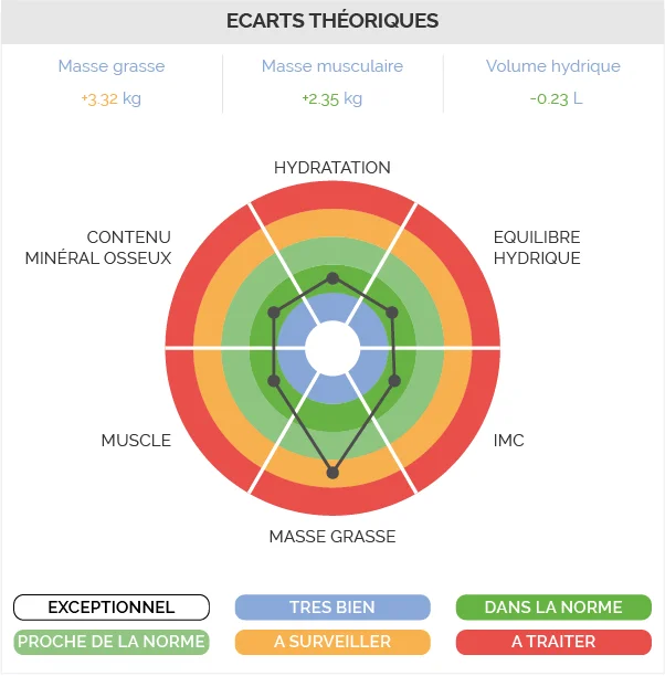 Ce module permet de suivre des indicateurs essentiels : contenu minéral osseux, équilibre hydrique, hydratation hors graisse, masse musculaire et masse grasse.