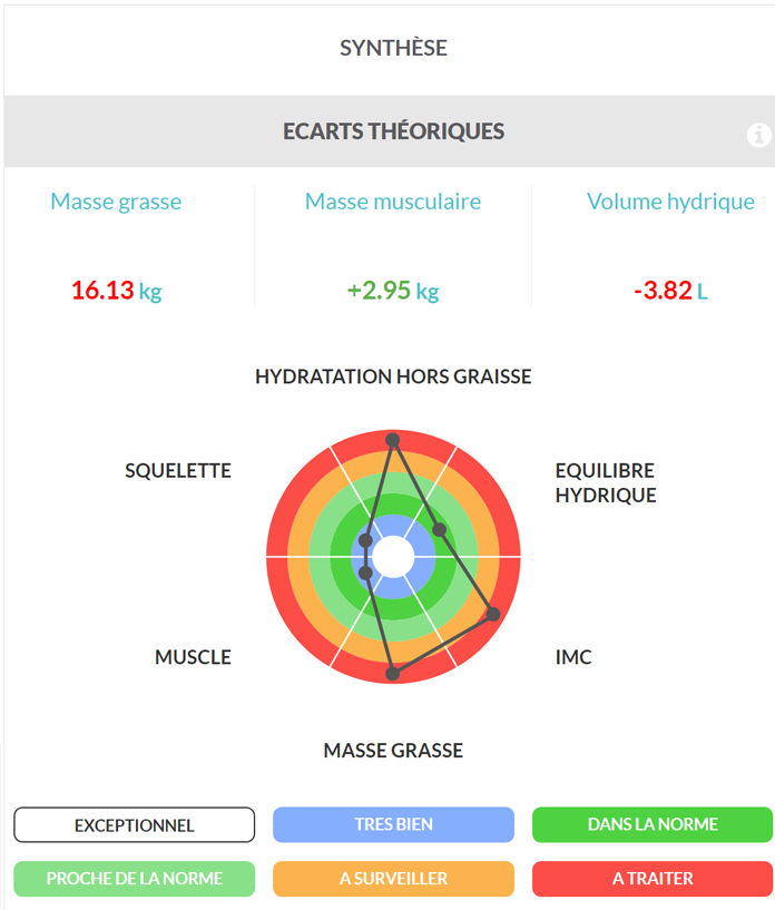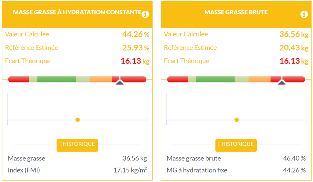 La paciente presenta una masa grasa bruta de 36,56 kg, es decir, 16,13 kg de masa grasa adicional en comparación con su referencia, un porcentaje de masa grasa del 46,40% y un porcentaje de masa grasa a hidratación constante, es decir, normalizado por su peso a una hidratación perfecta, del 44,26%. Estas cifras confirman la obesidad significativa de esta paciente.