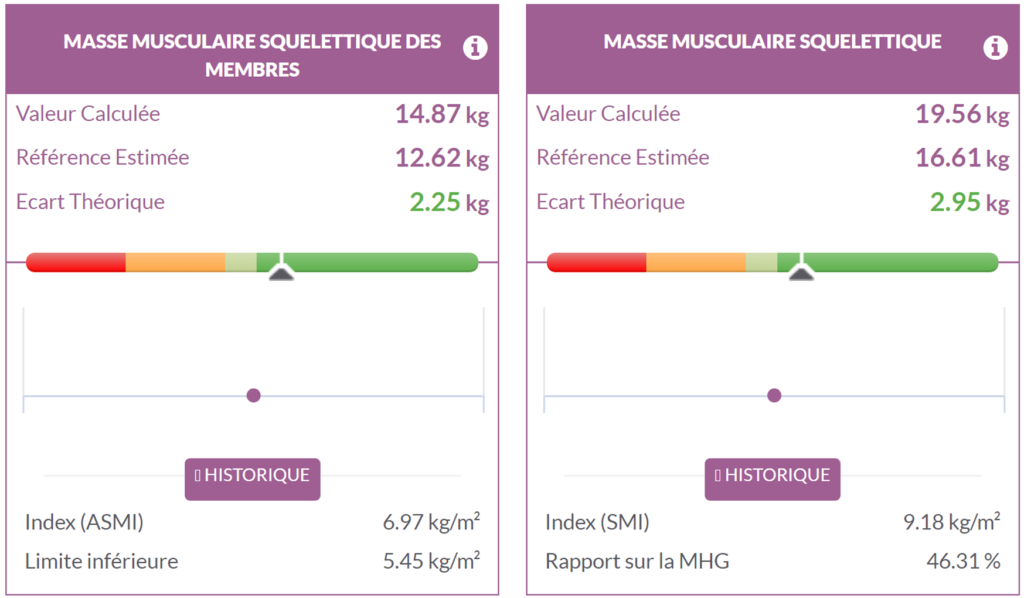 Así, esto significa que esta paciente tiene una masa proteica total similar a su referencia, que corresponde a un IMC normal. Esto indicaría que esta paciente tendría una masa proteica muscular idéntica a la de una persona con un IMC normal, lo que confirma que su masa muscular esquelética no es suficiente en relación con su masa corporal.