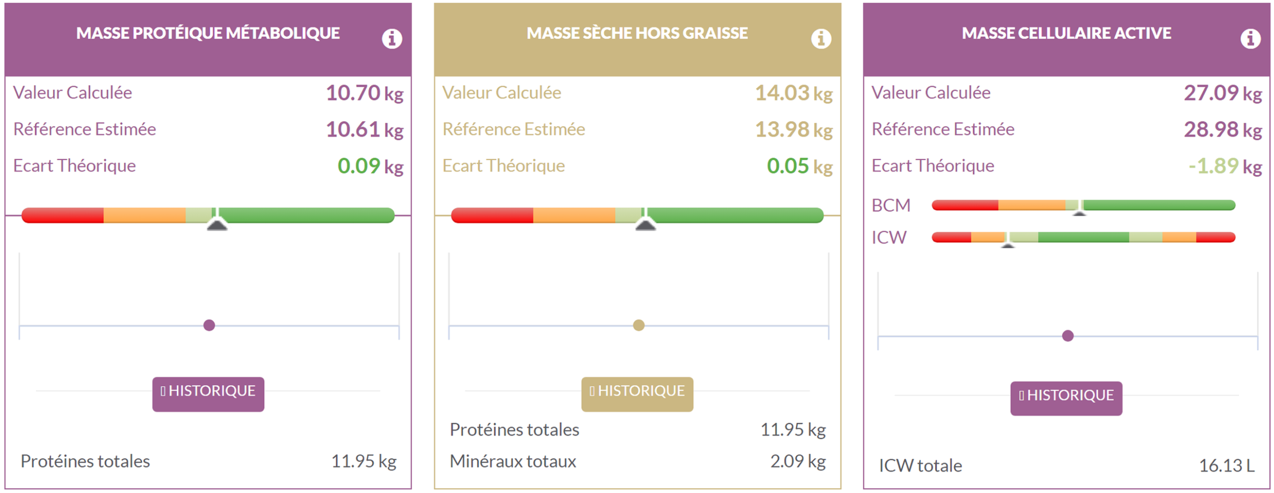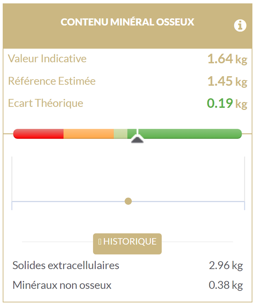 Estos tres parámetros pueden utilizarse para confirmar la presencia de obesidad sarcopénica, ya que su modificación a lo largo del tiempo está estrechamente relacionada con la cantidad de proteínas en el cuerpo humano, y en particular en el músculo esquelético. De hecho, la masa proteica metabólica representa la cantidad total de proteínas contenidas en las células, mientras que la masa seca sin grasa representa el conjunto de proteínas y minerales del organismo. Podemos observar que la masa proteica metabólica y la masa seca sin grasa están muy cerca de la referencia para esta paciente. Además, la masa celular activa presenta un déficit de 1,89 kg en comparación con la referencia, con una masa celular (BCM) al nivel de la referencia y una deshidratación intracelular.