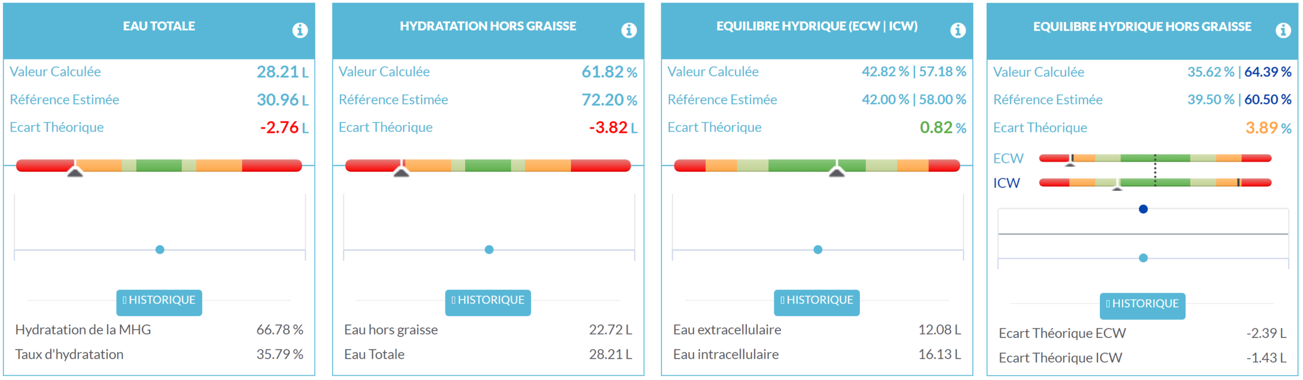 En cuanto al equilibrio hídrico, podemos observar que el equilibrio hídrico total se mantiene, pero si nos enfocamos únicamente en la masa sin grasa, podemos confirmar la deshidratación previamente observada. También podemos notar que la deshidratación es mucho más pronunciada en el compartimento extracelular. Esta diferencia entre el equilibrio hídrico total y el equilibrio hídrico sin grasa puede explicarse por la distribución del agua dentro de la masa grasa, donde el 80% del agua se encuentra en el compartimento extracelular. De hecho, la mayor parte del agua extracelular se encuentra en la masa grasa, creando un equilibrio hídrico artificial a nivel del organismo, mientras que la masa sin grasa está significativamente deshidratada. Así, también es necesario verificar el equilibrio hídrico sin grasa para controlar la distribución del agua dentro de los diferentes tejidos corporales.