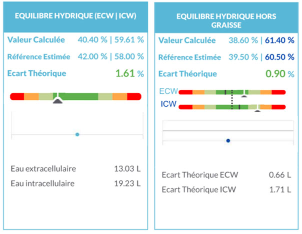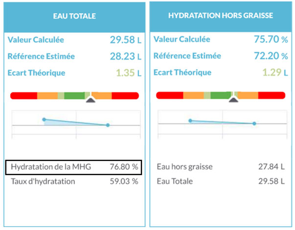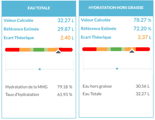En cuanto a la hidratación, podemos observar que el volumen de agua total es de 29,58 L y una hidratación de la masa sin grasa del 76,80 %, lo que indica que el volumen de agua extraído sería insuficiente para volver a un estado de hidratación normal. Esta observación se confirma por la hidratación sin grasa, que sigue siendo superior en un 3,5 % respecto a una tasa de hidratación ideal.