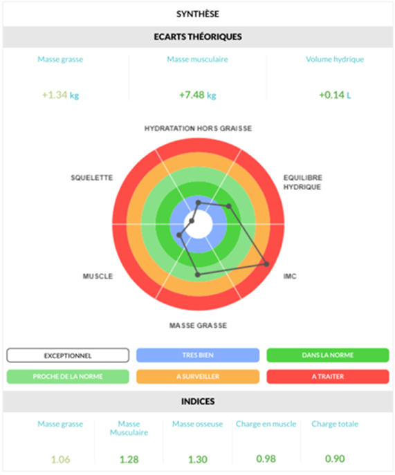 The “Hydration outside fat” and “Water balance outside fat” indicators aim to precisely study water movements within the FFM, where the organs ensuring normal body function are located. To do this, the two parameters use a value of water outside fat that is equal to the total water volume minus the water in adipose tissue, which is equal to 15% of the total water volume.