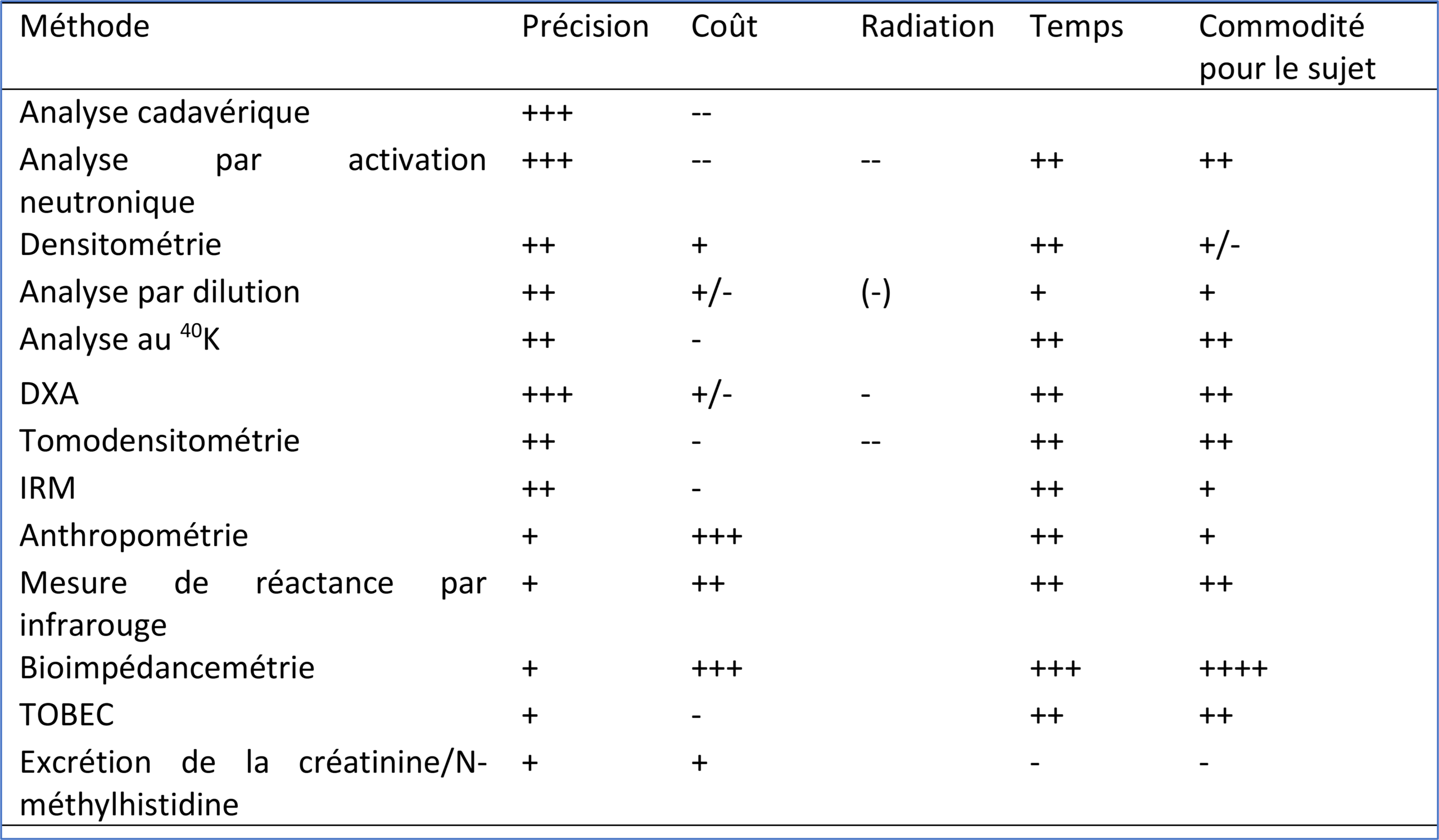 In 2009, in this chapter16, Deurenberg and Roubenoff summarized the principle, advantages, and disadvantages of each of these techniques, which they compiled in the table below: