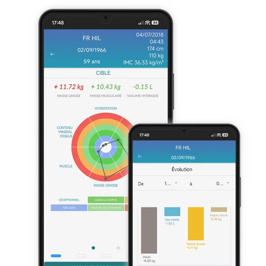 L’application BiodyConnect permet aux personnes suivies d’accéder facilement à leurs résultats et de visualiser l’évolution des principaux paramètres dans le temps, de manière claire et lisible.