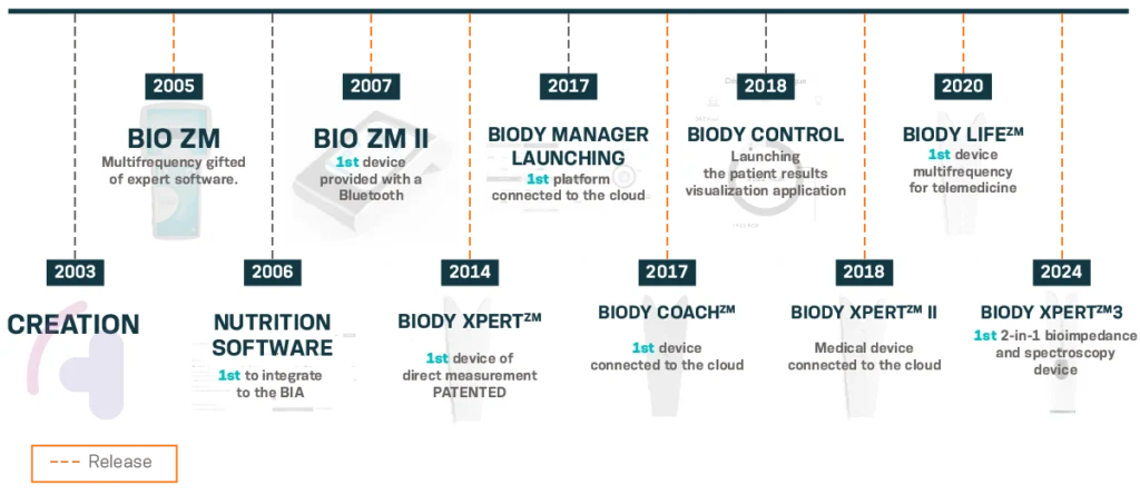 The company’s founder boosted by his passion for technology and innovation became interested in a new promising technique in the 1980’s, but still barely known in France: *bioimpedanciometry (BIA). The devices of that time were mono frequency and They provided only a small amount of information, generally seen on a small screen integrated to the device or by means of a printer In the early 1990’s aiming to improve its ergonomics and its performance the first device was developed using the new computer technologies of that time joining together its BIA device with a “Series 3 Organizer”. That way, the first portable BIA device wired and computerized was born. In the mid 1990’s the first multi-frequency devices appeared, in that particular moment it had significant advantages over the single/mono frequency devices.