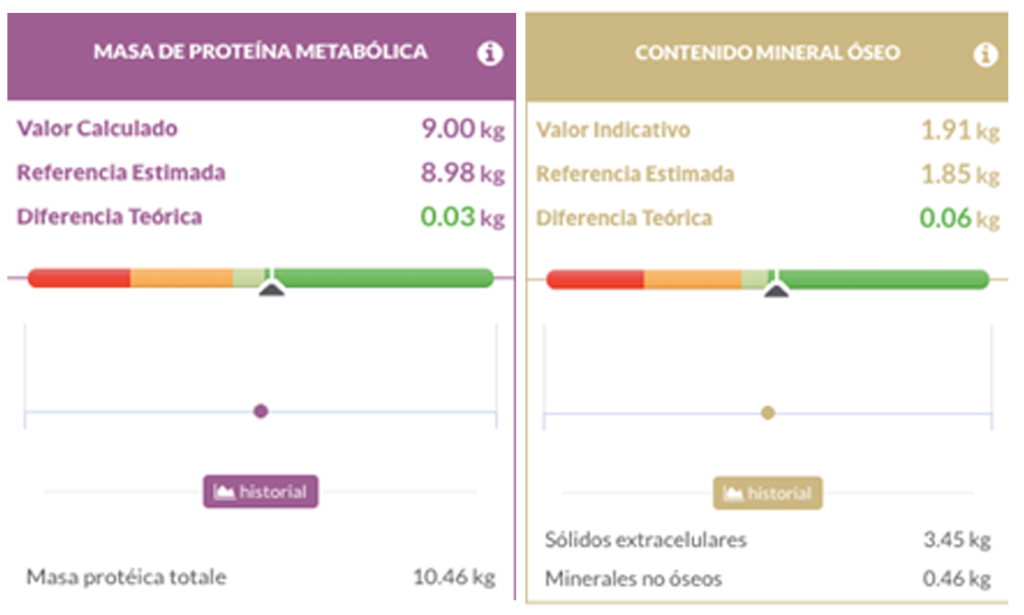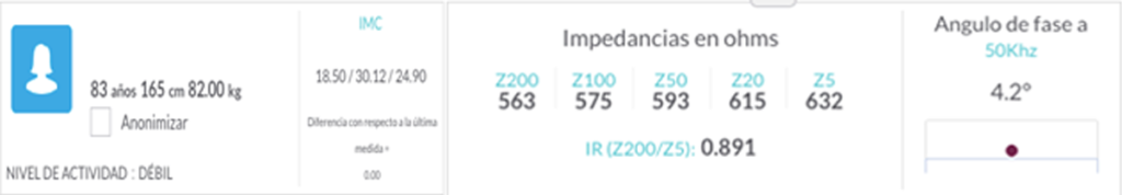 The indicators of fat mass at constant hydration and fat-free dry mass corroborate the values presented on the chart; in geriatrics, in an elderly person, fat-free dry mass (muscle, proteins, and minerals) is a fundamental indicator for monitoring medical and nutritional interventions, as it allows determining if weight losses or gains are due to fat, water, or proteins and muscle mass; in this case, fat-free dry mass confirms that the patient’s muscle mass is a protective factor.