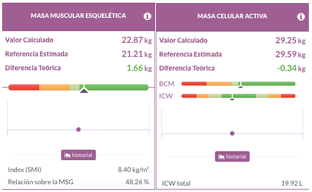 Esta afirmación se sustenta en los indicadores de su masa muscular esquelética y masa de proteína metabólica (ambas normales), lo que implica que la paciente no presenta riesgo de sarcopenía; su masa celular activa está por debajo de la referencia en 340 gr; lo que también corrobora lo expuesto en la literatura, cuando plantea que el ángulo de fase es predictor de la masa celular corporal. El contenido mineral óseo es normal, lo que es indicador de que tampoco hay riesgo de osteopenia u osteosisntesis.